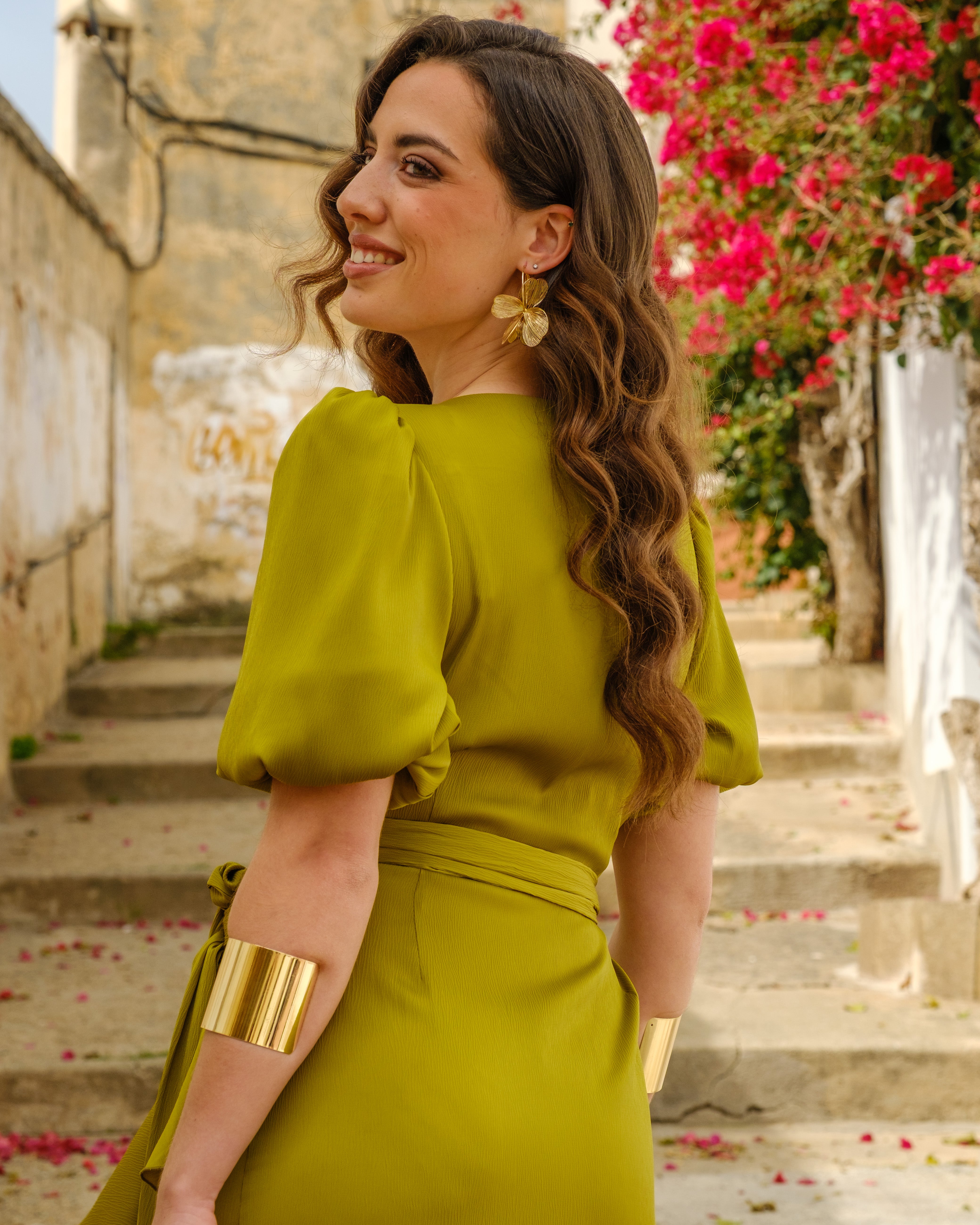 Pendiente en forma de flor con un aro dorado ideal para combinar con cualquier look.