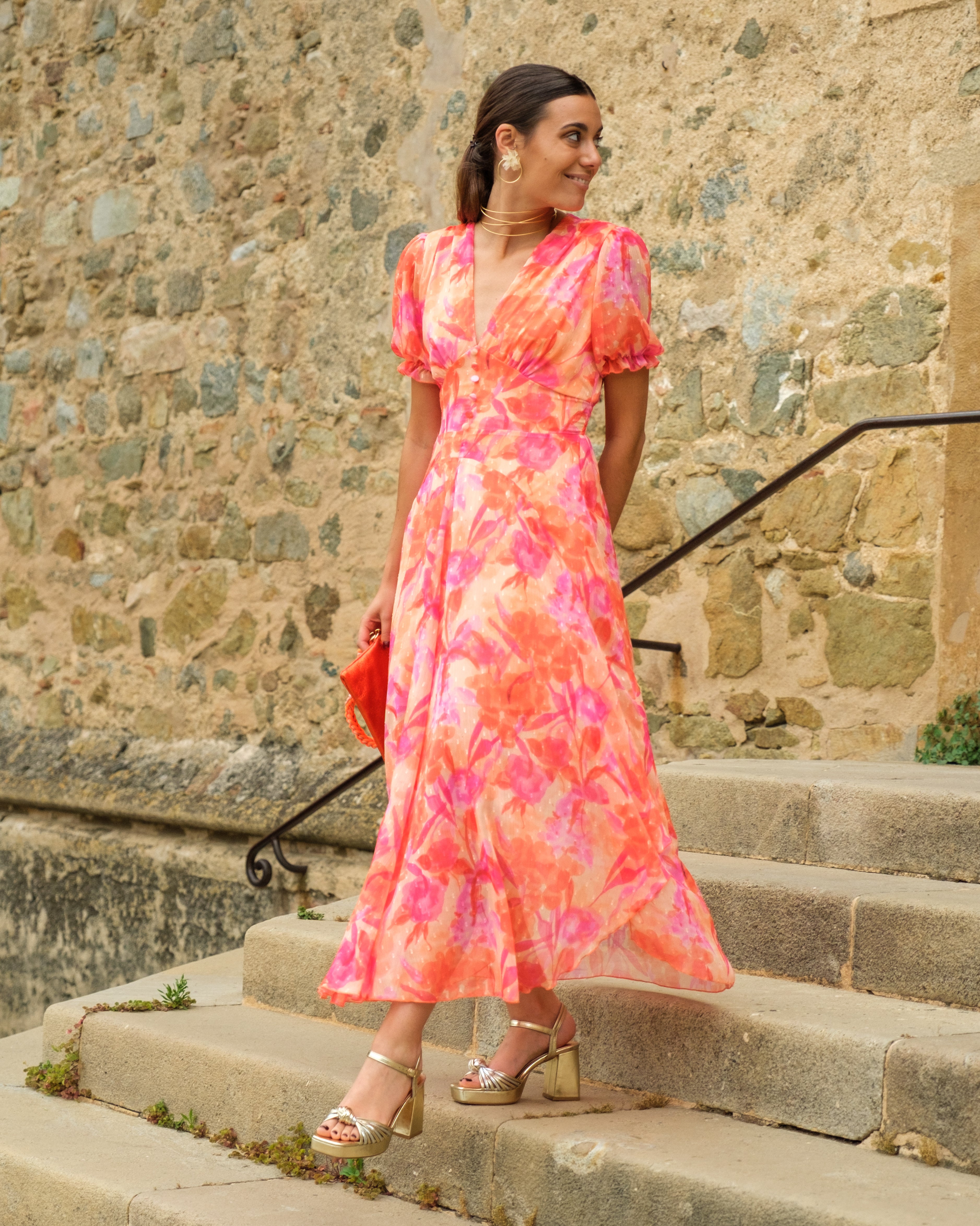 Pendiente en forma de flor con un aro dorado ideal para combinar con cualquier look.