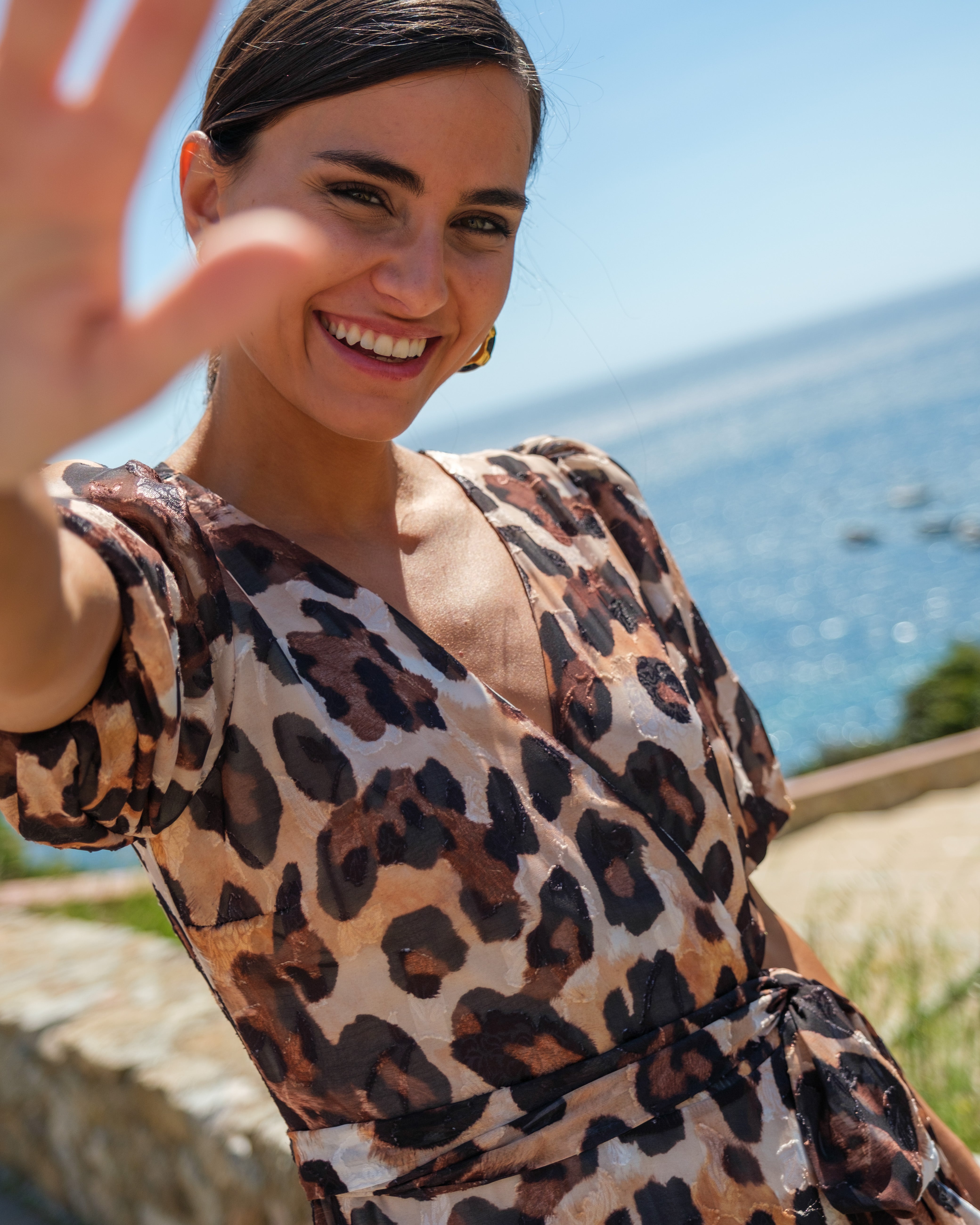 Vestido midi con estampado leopardo sobre un tejido de jacquard. Cruzado, cierre con gran lazada. Escote en pico y con la cintura ligeramente más ajustada con goma trasera para una mayor adaptación al cuerpo. Manga abuñonada con elástico al final. Bajo del vestido con un gran volante. Incluye forro interior. Un vestido ideal para las invitadas con un toque de color muy especial. También perfecto para primeros meses de embarazo y lactancia.