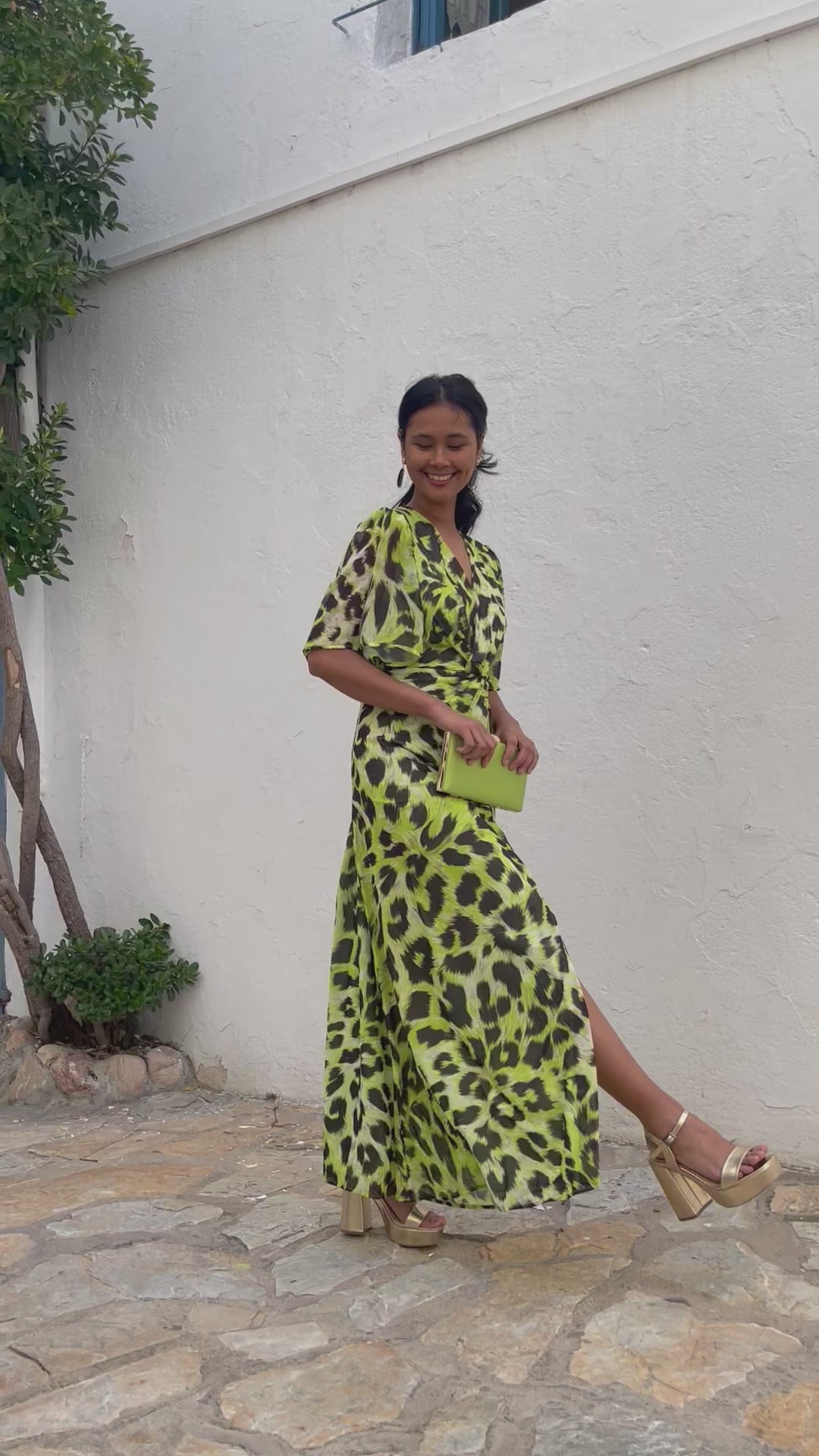 Vestido largo animal print elaborado en tejido de georgette, escote en pico con detalle de nudo y corte bajo el pecho. Manga corta estilo mariposa. falda larga ligeramente acampanada con abertura en el frente para crear mayor comodidad al andar.