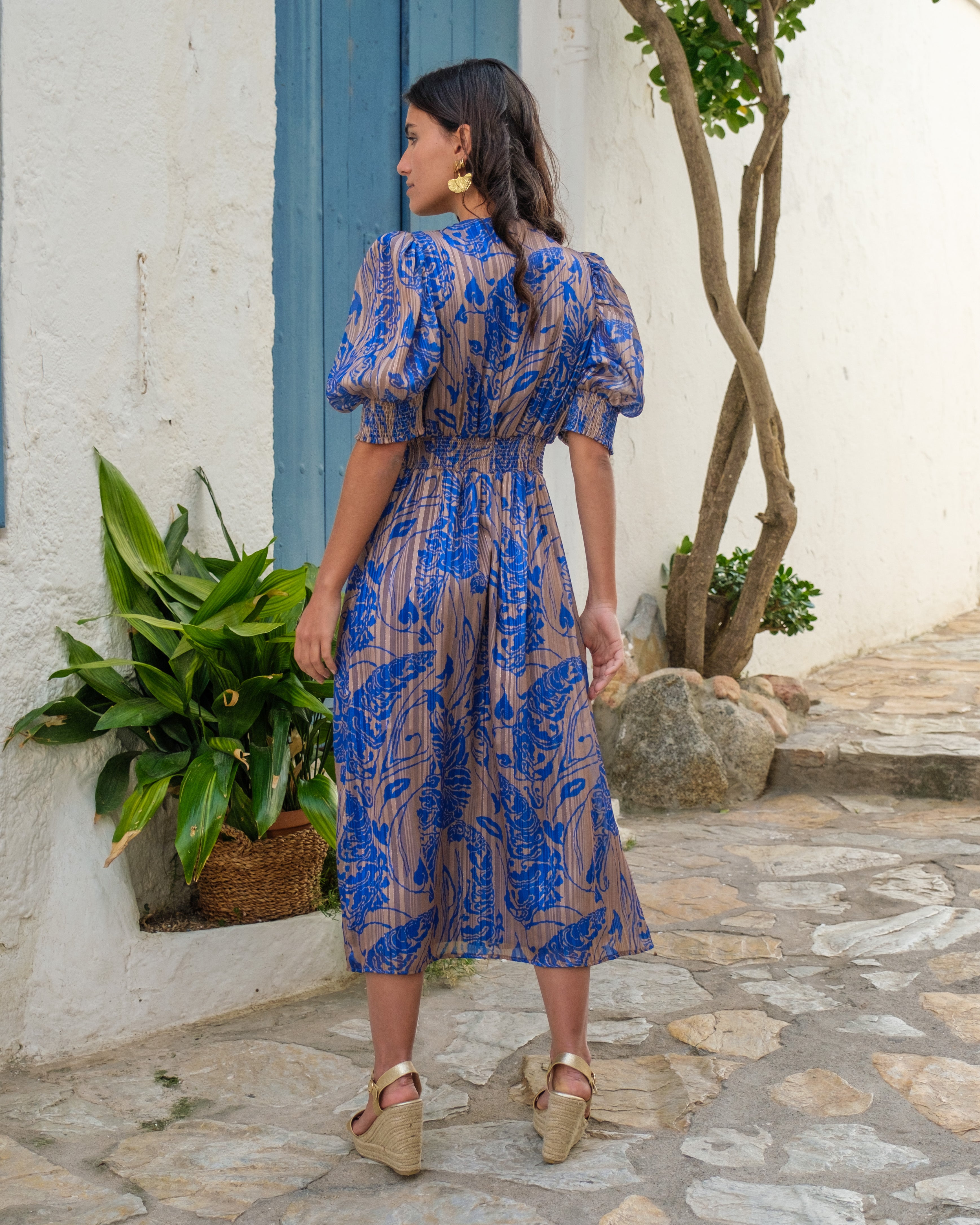 Tejido en hilo de plata. Vestido midi. Bajo semivuelo. Manga corta. Escote en pico con detalle de botones forrados en delantero. Cinturilla elástica en la espalda.