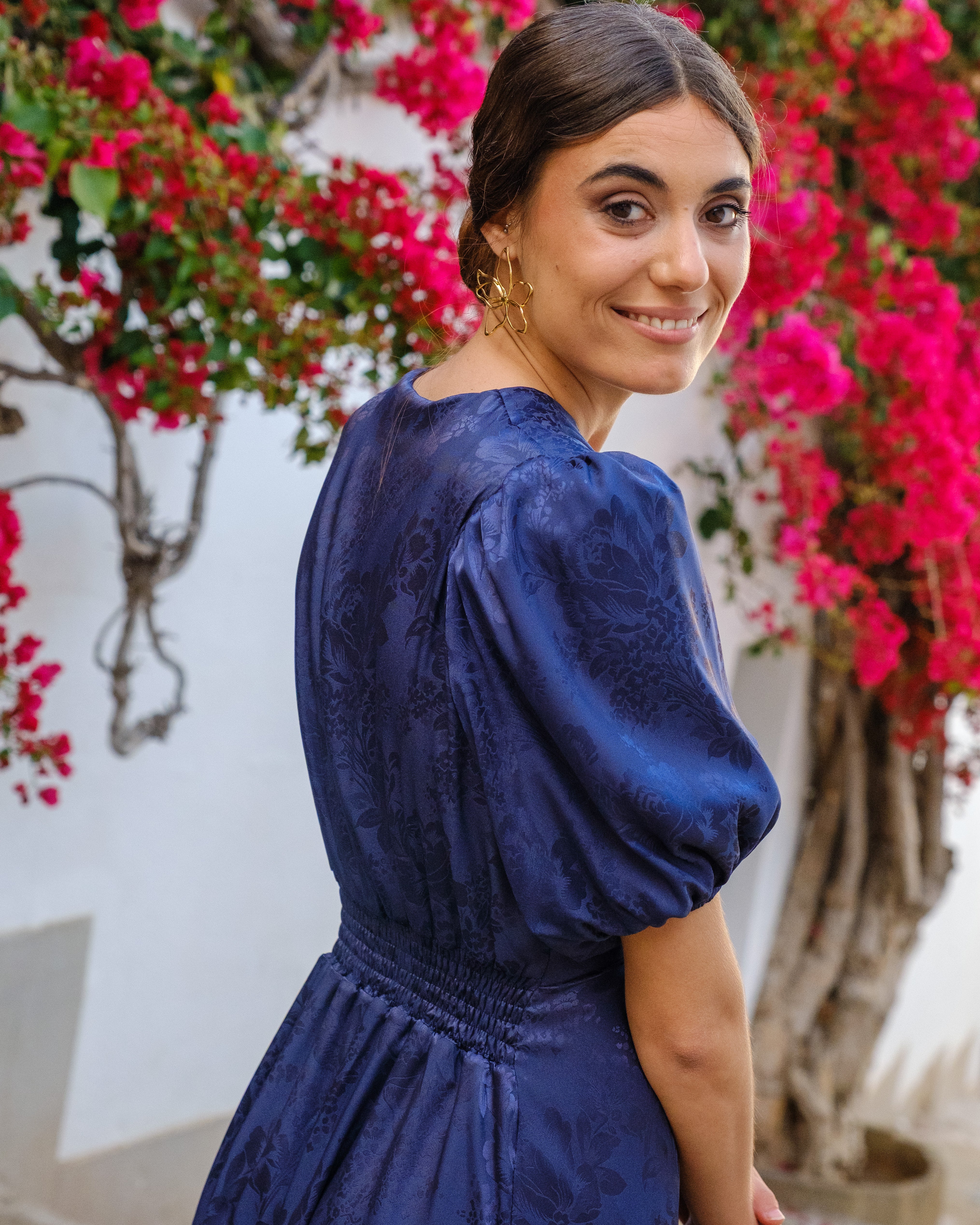 Vestido largo elaborado en tejido Jaquard, escote en pico con detalle de nudo y corte bajo el pecho. Manga corta abullonada. Falda larga ligeramente acampanada con abertura en el frente para crear mayor comodidad al andar.